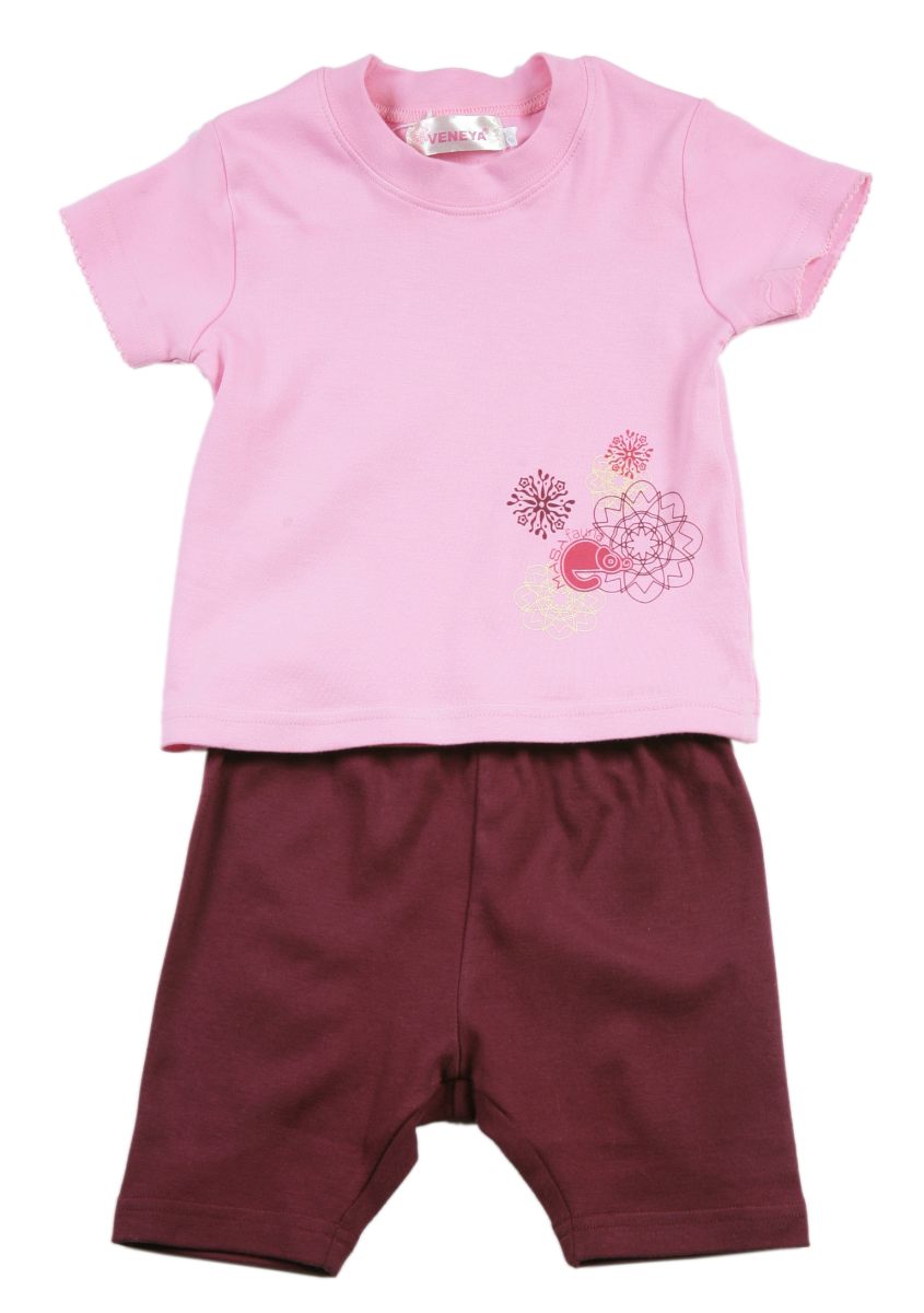 2 сочетания: жёлтая футболка + тёмно-синие шорты, розовая футболка + бордовые шорты