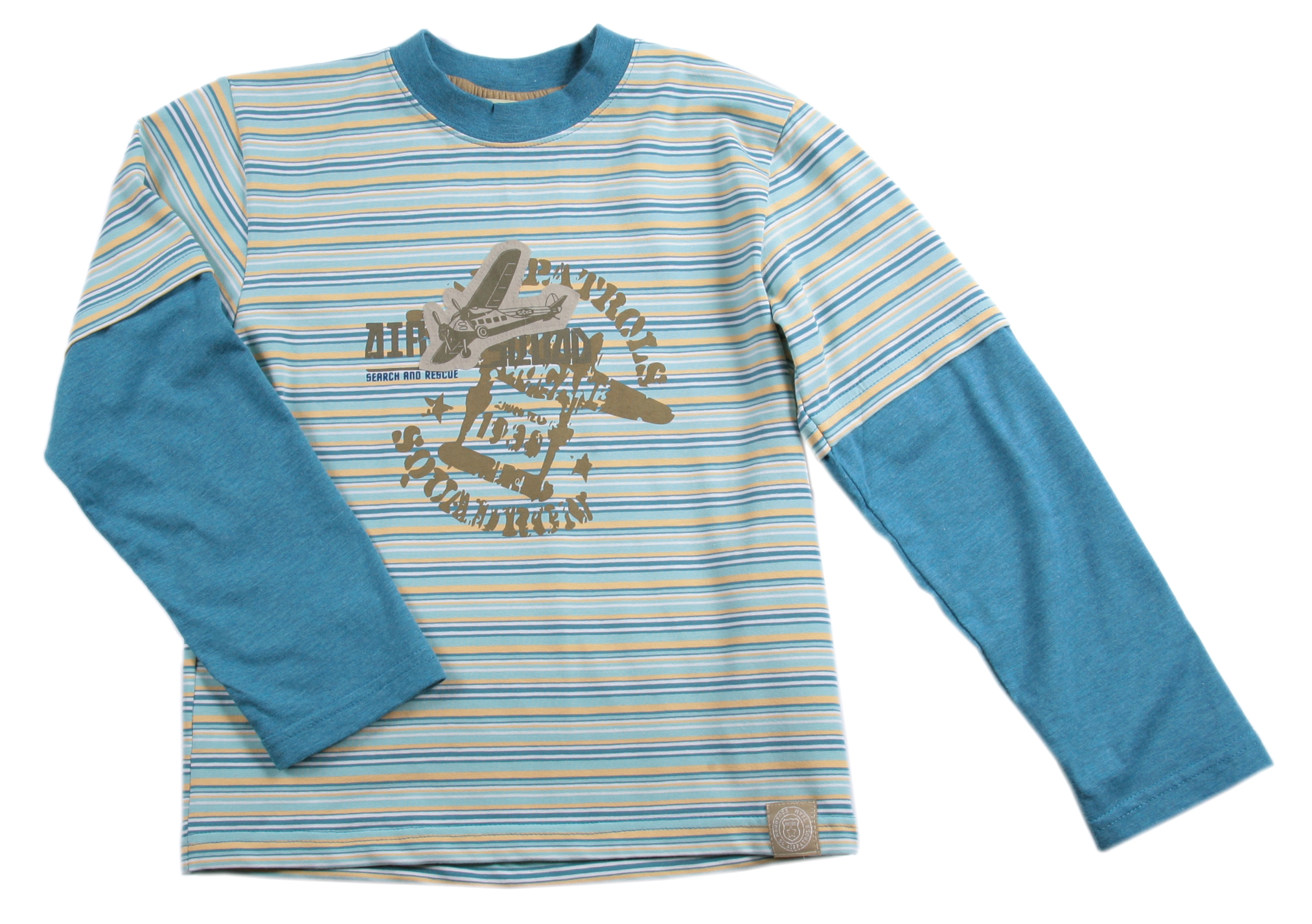 Меланж + материал в полоску, сочетание цветов: синяя полоска + песочный/синий рукав