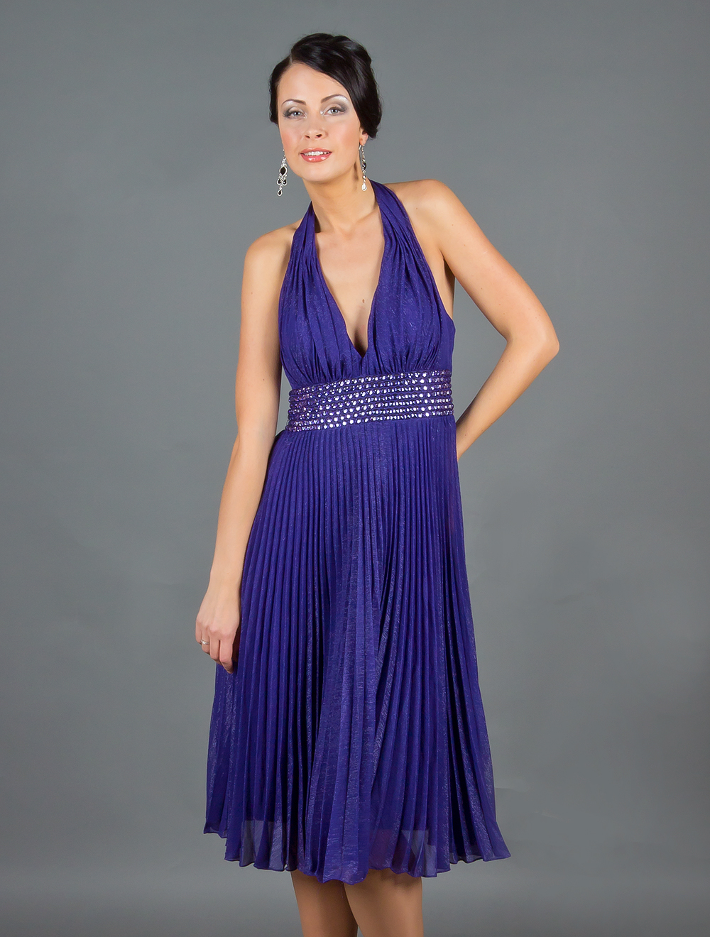 Особенность ткани - немнущийся шифон гофре с фактурным плетением, скроенный по косой. Расширенная к низу юбка изящно подчеркивает линию бедер. Особое достоинство – удачная посадка для любой фигуры – на груди имеются чашки с поролоновыми вставками - удобство в носке без бюстгальтера.