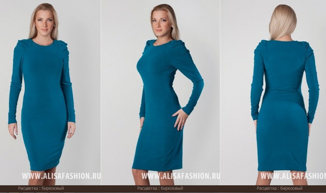 Элегантное стильное бирюзовое платье-футляр из трикотажного полотна с примесью шерсти. Цельнокроеная полочка и спинка подчеркивают эффект плавности изгибов и линий фигуры.